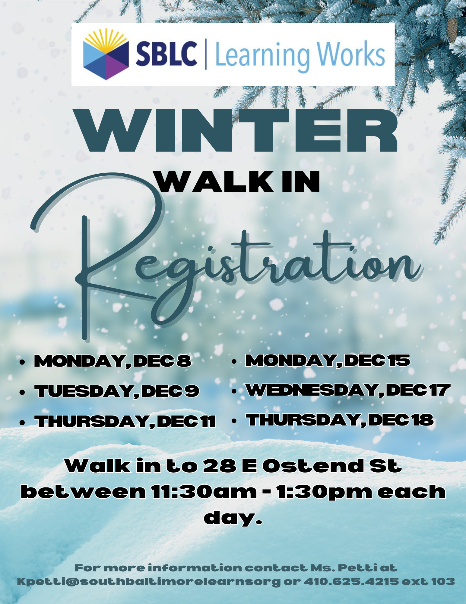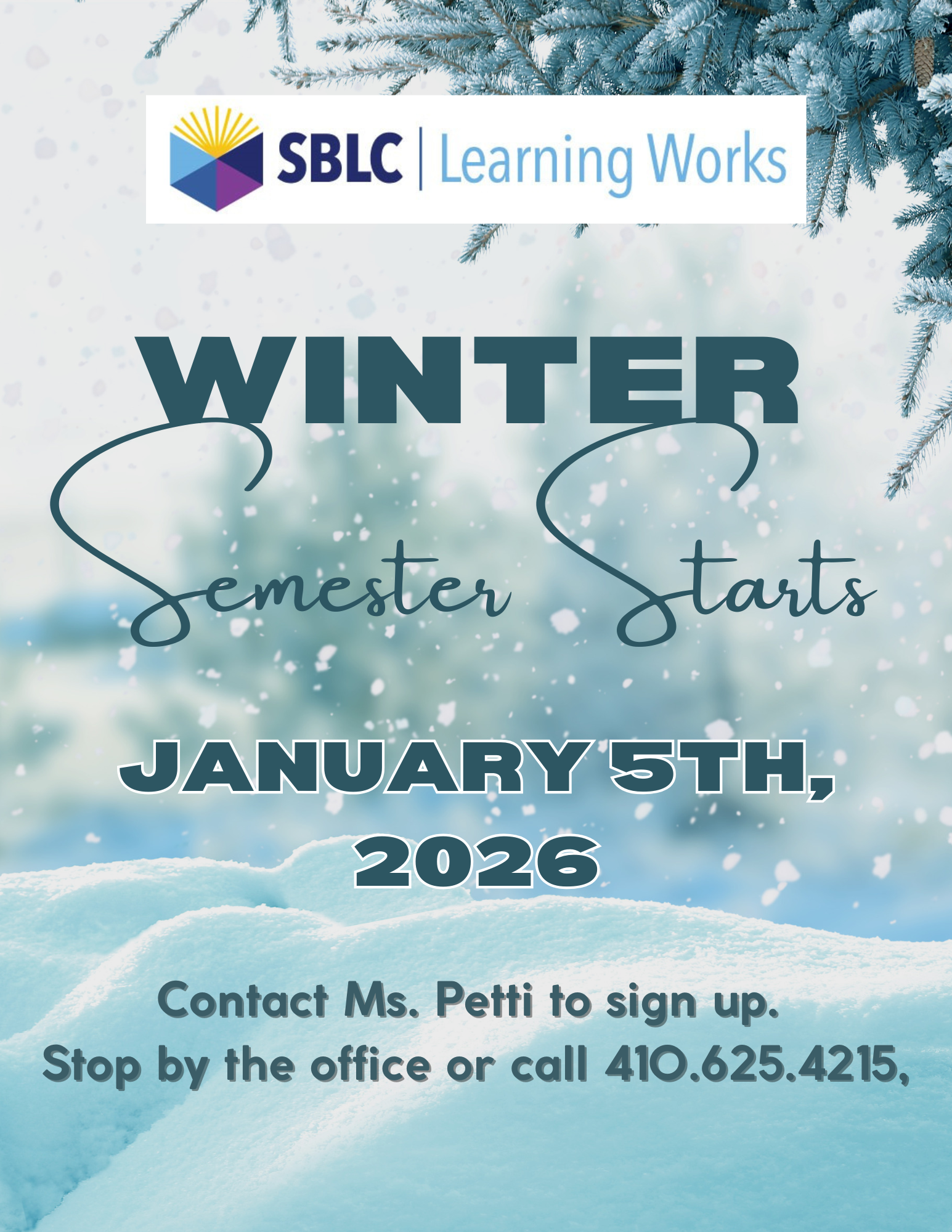 REGISTRATION FOR THE WINTER SEMESTER STARTS TODAY! Contact Ms. Petti to signup for classes Stop by the SBLC|Learning Works office at 28 E Ostend St or call: 410.625.4215, ext. 103 for Kelsey Petti We can't wait to meet you and look forward to assisting you on your educational journey!